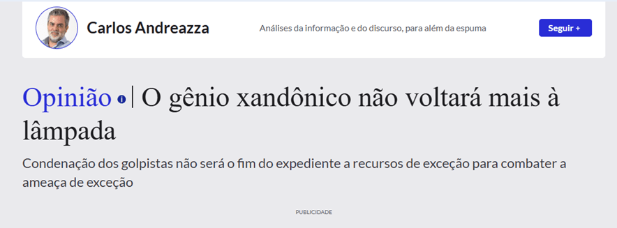 O artigo “O gênio xandônico não voltará mais à lâmpada”, de Carlos Andreazza, publicado em 28 de novembro de 2025, é o registro jornalístico mais importante desde a redemocratização, pois é a confissão mais explícita já feita pela mídia progressista sobre o regime de exceção judicial que se consolidou no Brasil. Diferentemente dos textos que tentam disfarçar arbitrariedades sob o pretexto da defesa da democracia, Andreazza assume sem rodeios que não houve simples excessos, mas uma transformação estrutural do sistema: aquilo que Moraes fez não foi uma sequência de decisões extraordinárias — foi a criação de um modelo de poder. Ele afirma, de forma quase didática, que o “gênio” não volta mais para a lâmpada porque o precedente institucional permanece mesmo que o operador mude. É a admissão de que o país passou por uma mutação constitucional informal, na qual o tribunal reinventou suas próprias prerrogativas.