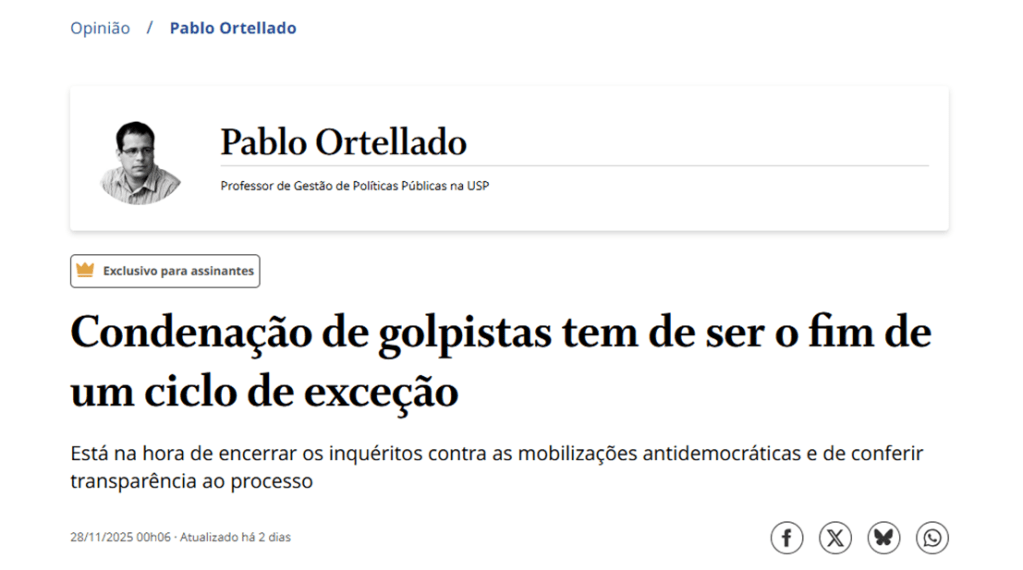 O artigo “Condenação de golpistas tem de ser o fim de um ciclo de exceção”, de Pablo Ortellado, publicado em 28 de novembro de 2025, é um daqueles momentos raros em que a hegemonia progressista tira a máscara — não por arrependimento, mas porque acredita ter vencido de forma definitiva. O texto celebra a prisão de Jair Bolsonaro como o fechamento de um ciclo histórico e, nesse mesmo movimento, admite de maneira clara, linear e quase burocrática que o Supremo Tribunal Federal atravessou anos atuando fora dos limites constitucionais.